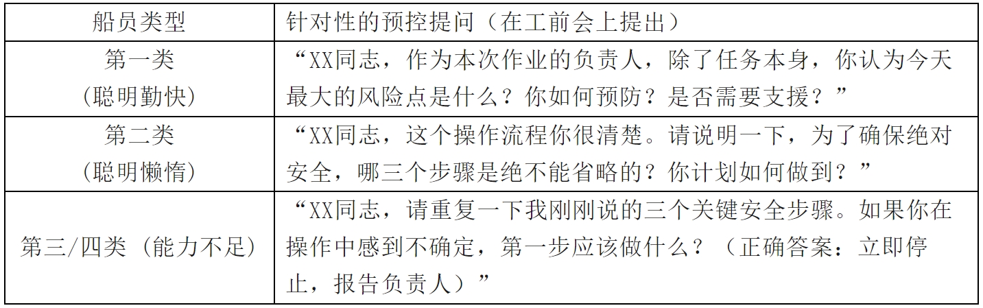 针对第四类船员(愚蠢勤快), 问题应更具体、更侧重于复核:“请复述今日关键操作步骤。当不确定时,是否立即停止并报告?”