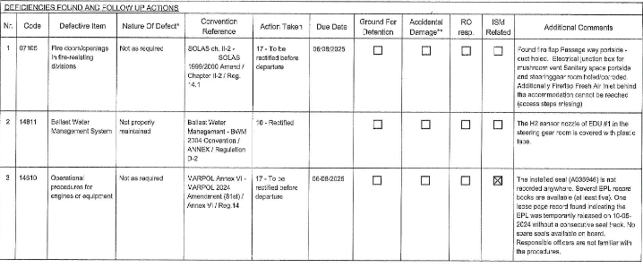 尤其是,PSCO在综合检查后指出,ISM体系存在实施缺陷,要求公司在三个月内完成整改,且船舶需在报告发布后三个月方可申请复查。