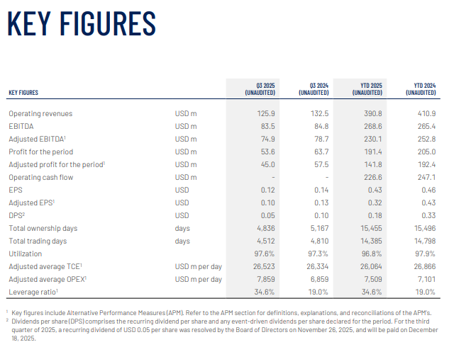 财报显示,三季度该公司实现营业收入 1.259亿美元,EBITDA达 8350万美元,调整后EBITDA为 7490万美元,与去年同期相比仅小幅下降,反映出在售船减少船队规模情况下,公司依然通过更高的船期覆盖、更长的租约结构和更优的TCE表现来稳定盈利。此外,公司继续执行其稳定分红政策,本季度宣布分红 0.05美元/股,相当于调整后净利润的50%。