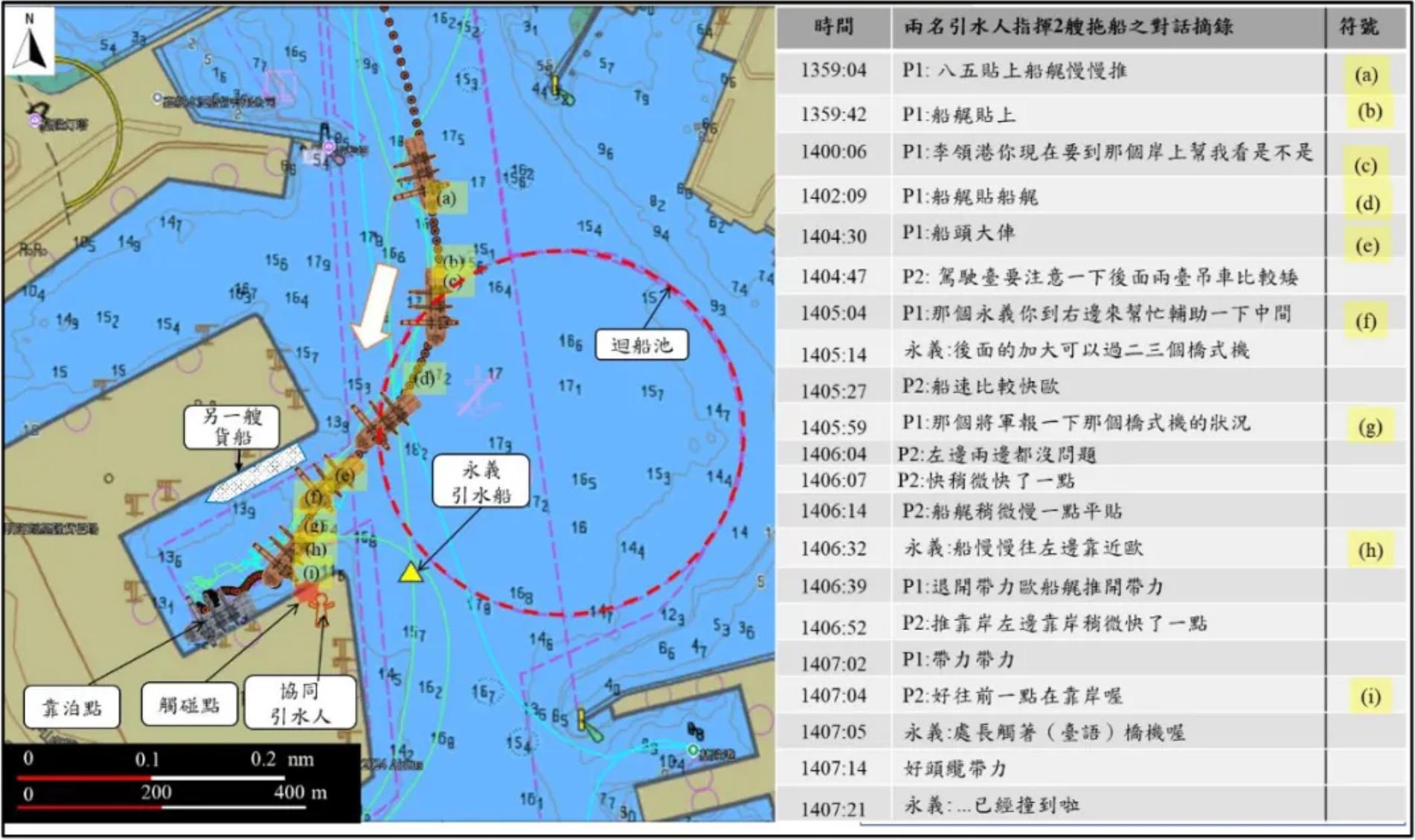 14时05分及14时06分,协同引航员两次提醒引航员船速较快。14时06分32秒(触碰前42秒),永义引航船驾驶提醒引航员:“船慢慢往左边靠近喔”。14时06分42秒及14时06分54 秒时(触碰前20秒,船速1.9节),引航员对艉拖(船尾拖轮)指令:“船尾退开带力”和“左满舵”。