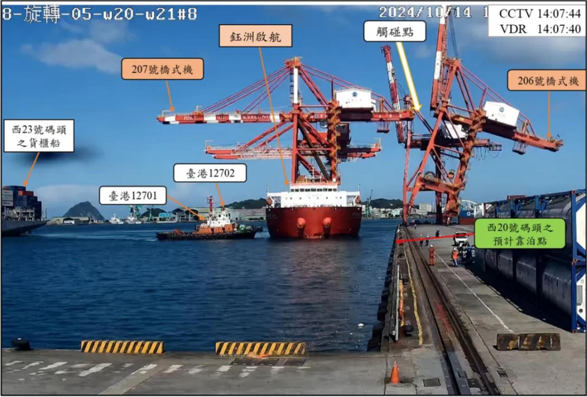 2024年10月14日,钰洲启航轮(简称“钰轮”)装载1台岸桥及2台卸煤机,预计靠泊中国台湾基隆港,并卸下该岸桥。14时07分,钰轮靠泊西20号码头过程中,所载的岸桥碰到码头上的1台岸桥,导致码头上岸桥倒塌和船上岸桥受损。