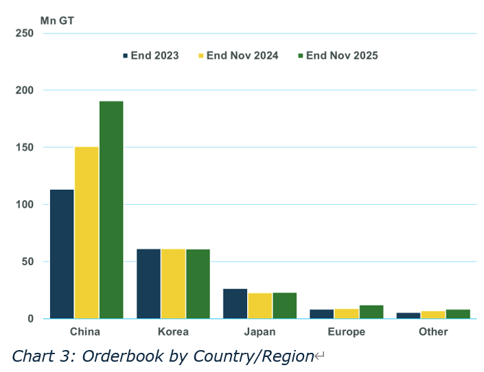 However, it will be developments in China that will determine the future of course of newbuilding prices. As Chart 3 shows, the orderbook in China has reached around 190 Mn GT, rising by more than two-thirds in two years. In contrast, all other regions are remarkably stable, particularly Korea, where the orderbook has flatlined at 60 Mn GT.
