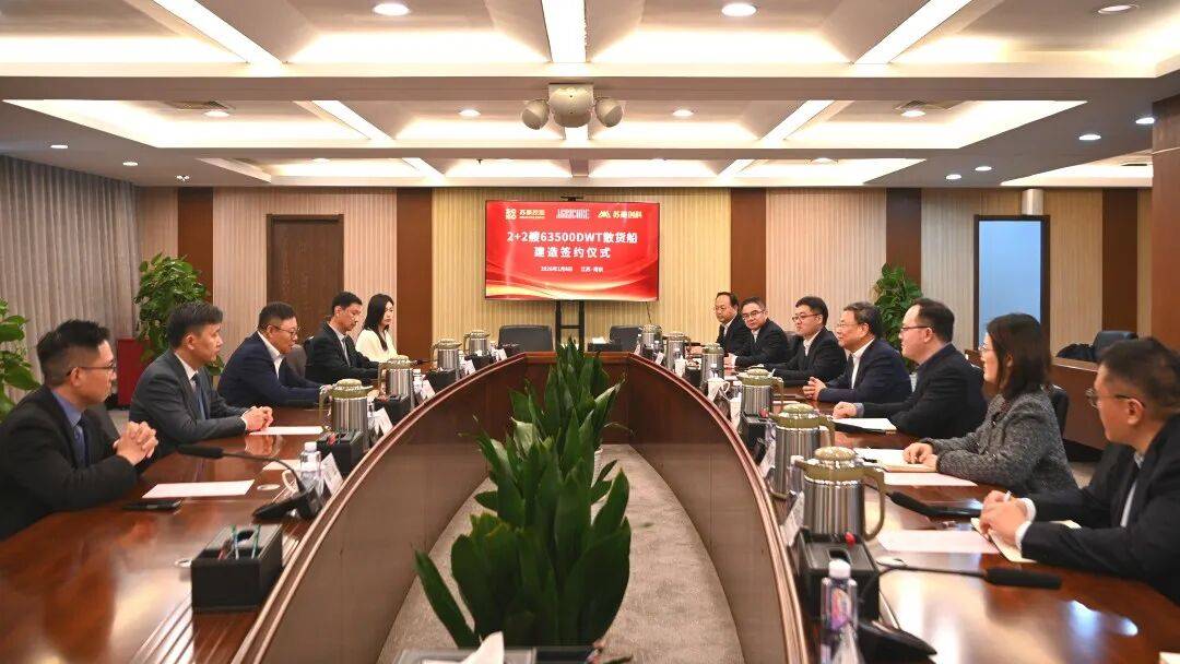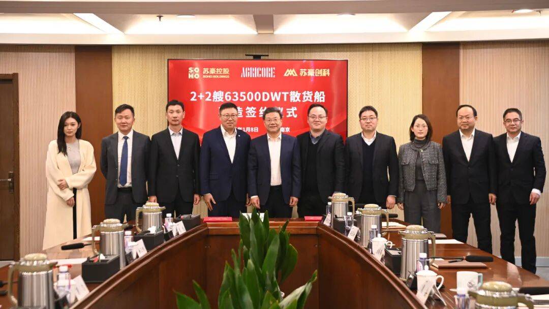 2026年1月8日,苏豪创科集团与香港良禾海运集团在江苏举行2+2艘63,500载重吨散货船建造合同签约仪式。苏豪创科集团党委书记、董事长周安与香港良禾海运集团副总裁彭飞共同签署合同,双方管理团队共同见证这一重要时刻。该项目亦成为苏豪创科船舶建造业务在新年开局阶段承接的首个订单。