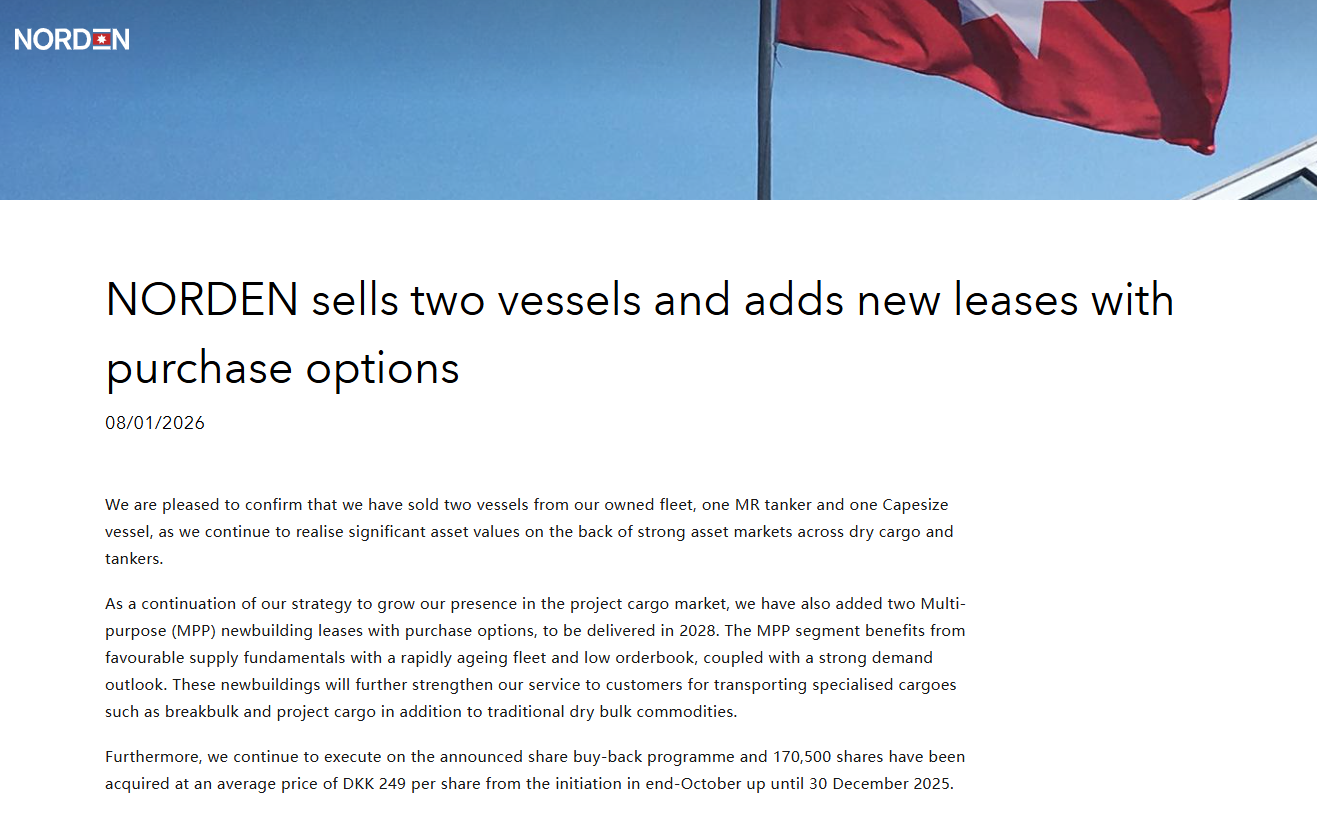 近日,NORDEN发布公告确认出售两艘自有船舶:一艘MR油轮与一艘Capesize散货船。该公司强调,此举是在干散与油轮资产市场均处强势、二手船价走高的窗口期进行的价值兑现。虽然Norden方面没有透露出售船舶的名字不过TradeWinds进一步披露,市场此前曾将NORDEN的一艘2015年建造、约49,600载重吨的MR(Nord Superior)出售联系在一起,成交价据称约3,380万美元(买家未披露)。
