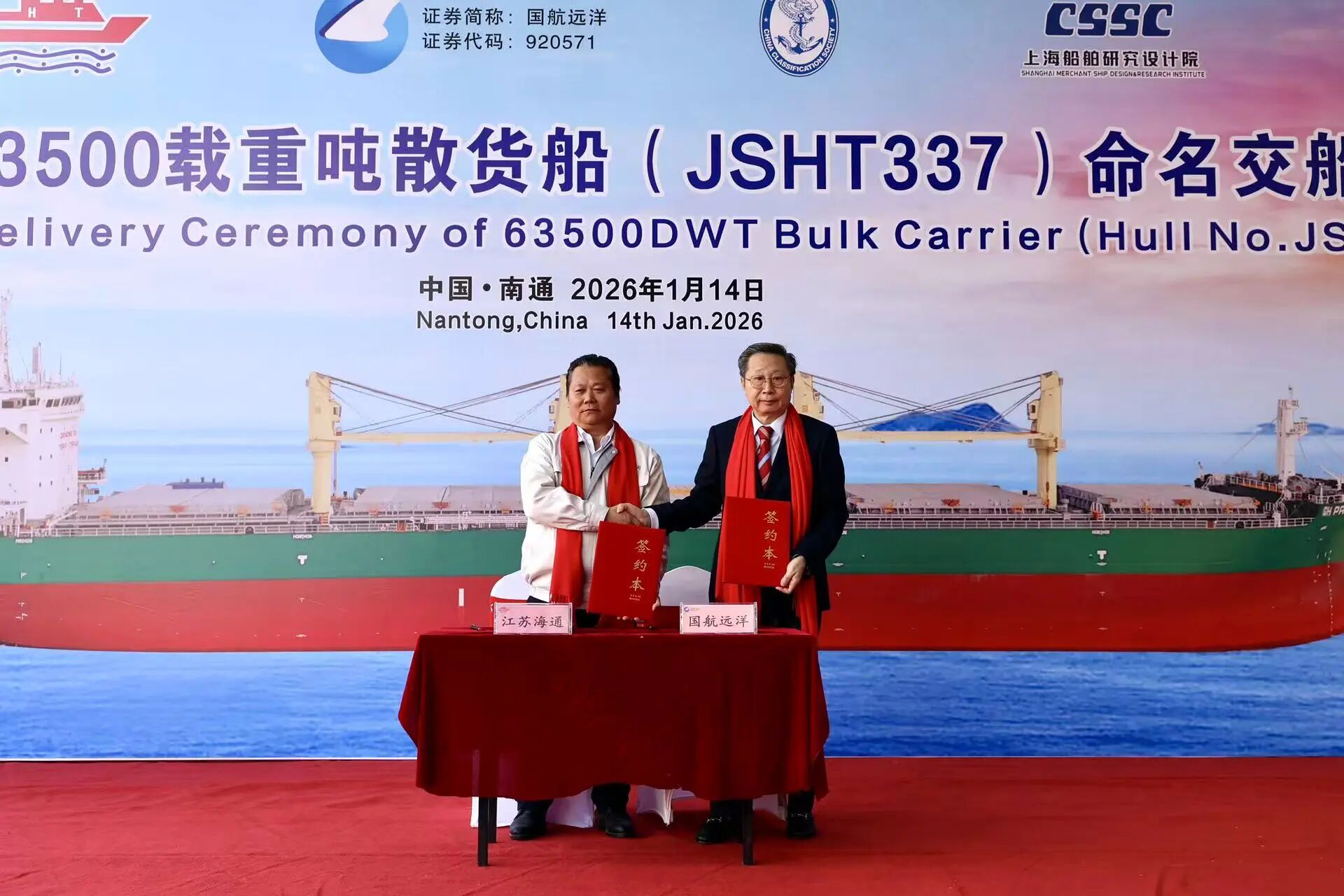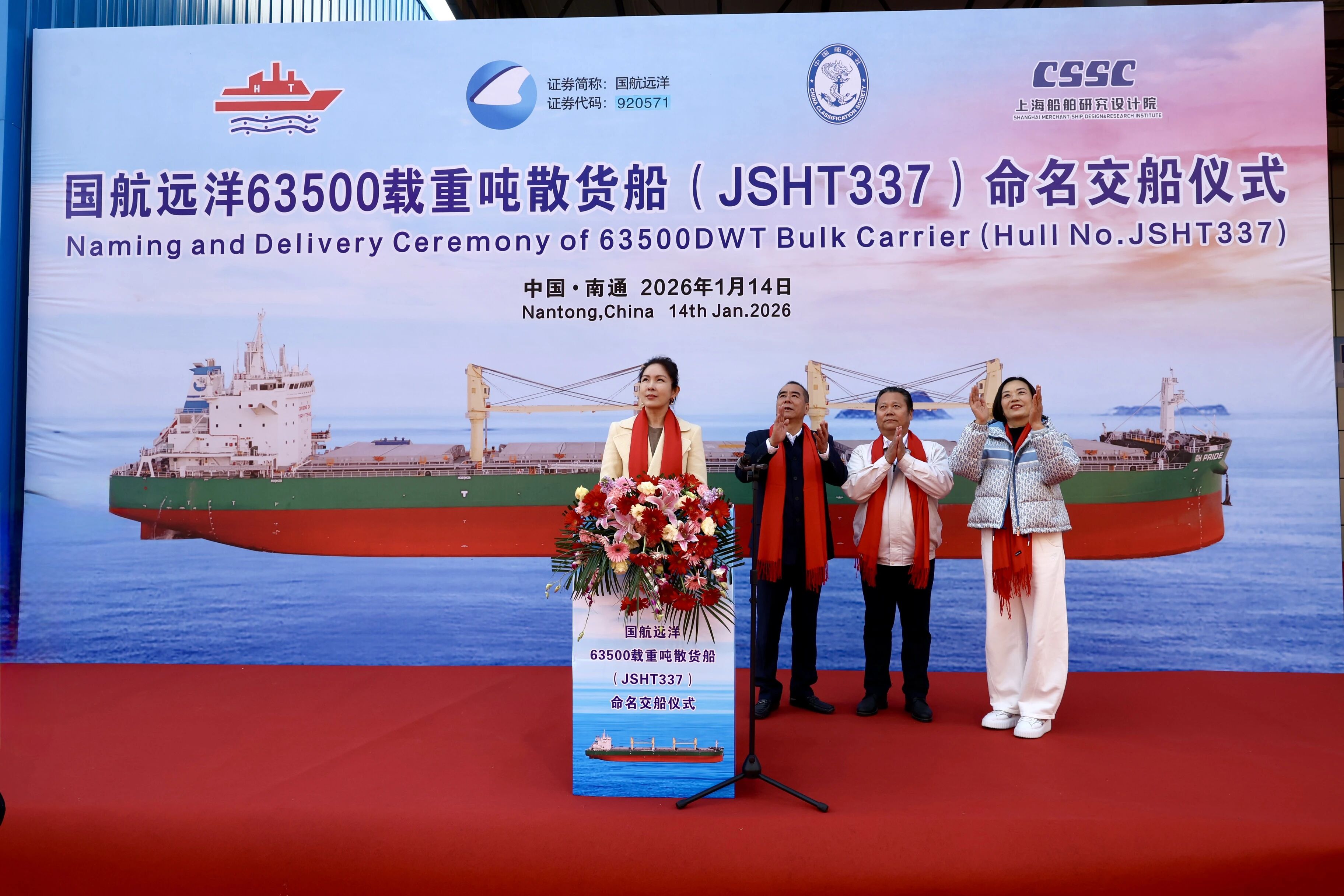 1月14日,江海潮涌,国航远洋新造首艘63500DWT散货船“GH PRIDE”轮交付仪式,在江苏南通隆重举行。