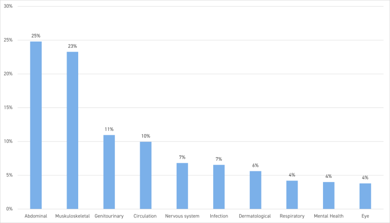 我们看到的大多数疾病索赔都与腹部疾病有关。在所有腹部疾病中,我们发现索赔数量最多的是阑尾炎(18%)、痔疮(16%)和疝气(14%)。以下将更详细地探讨这些较常见的疾病:
