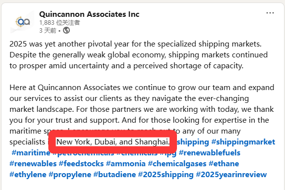 值得对照的是,就在新加坡办公室关闭消息披露前后,Quincannon Associates Inc在其公开渠道发布年终回顾称:2025年依然是专业化航运市场的关键一年。公司认为,尽管全球经济整体偏弱,但航运市场在不确定性中仍保持活跃,且市场普遍感受到“运力阶段性偏紧”的压力。