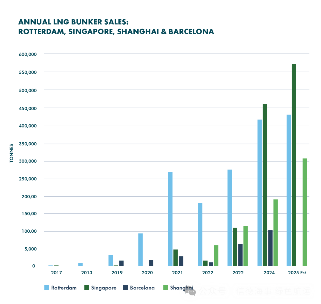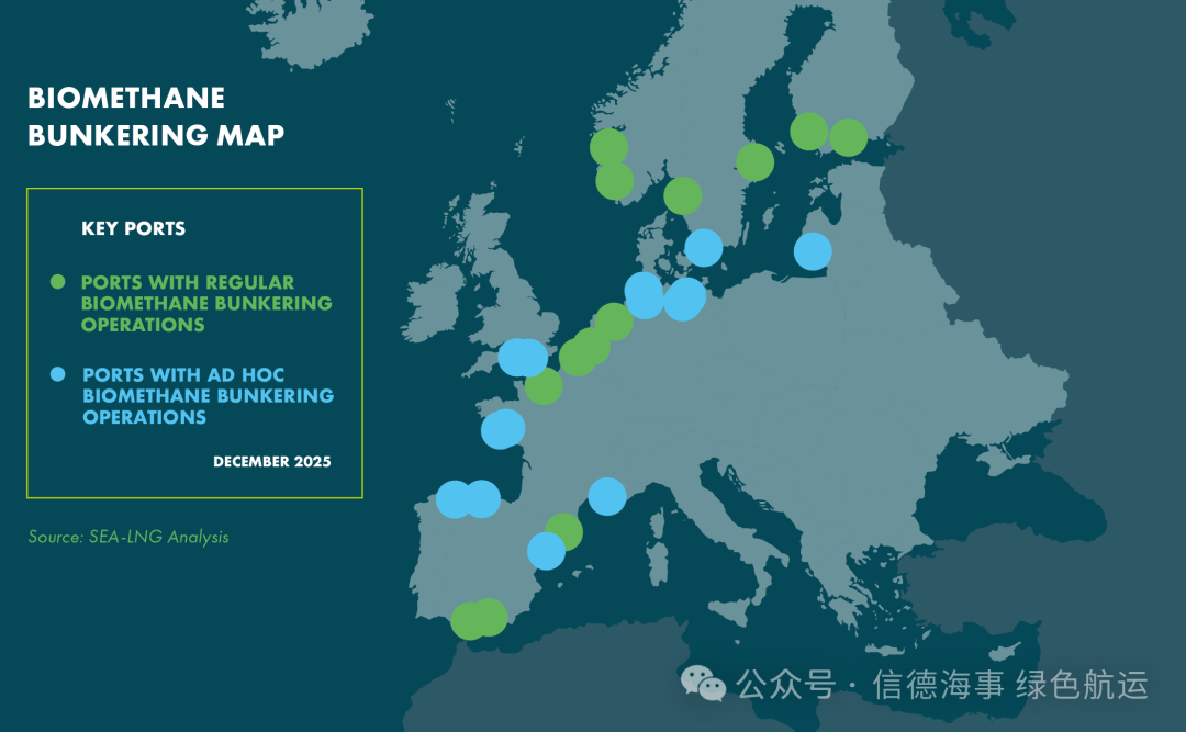 2025年更显著的变化,是LBM(液化生物甲烷)在欧洲加注的快速放量。报告直言,过去一年欧洲LBM加注“出现爆发式增长”,主要由更严格的欧盟监管要求以及客户侧自愿减排承诺共同驱动;LBM加注已经在比利时、法国、芬兰、意大利、立陶宛、荷兰、挪威、西班牙、瑞典和英国等关键港口展开,并至少涉及10家主要加注供应商。