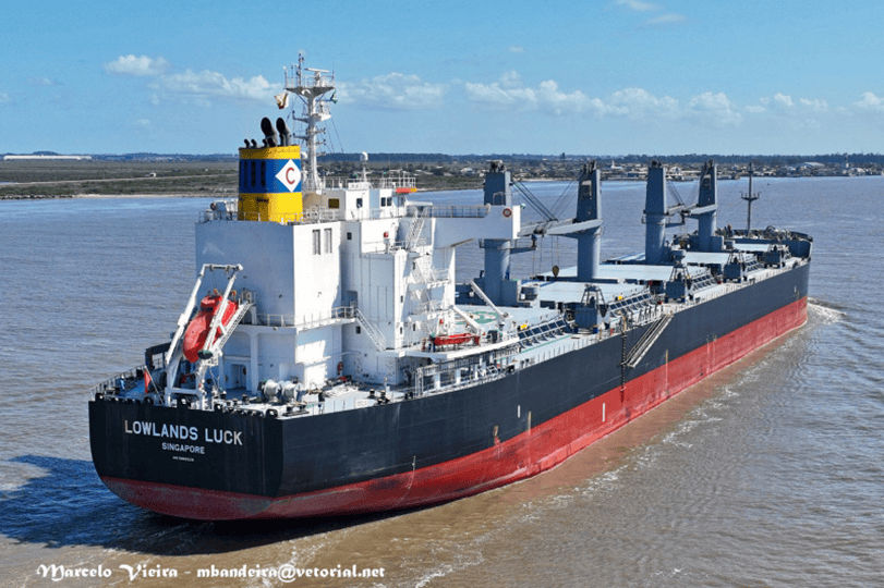 空载的“Lowlands Luck”轮船长199米、载重吨为6.35万吨,2023年建造,干舷高度较高。
