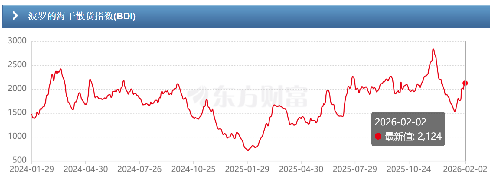 目前,据东方财富网的数据显示,BDI指数从1月15日低点1532上涨至1月30日高高点2148,上涨近40%。BDI强势暴涨,干散货市场整体呈现出淡季不淡的情况。