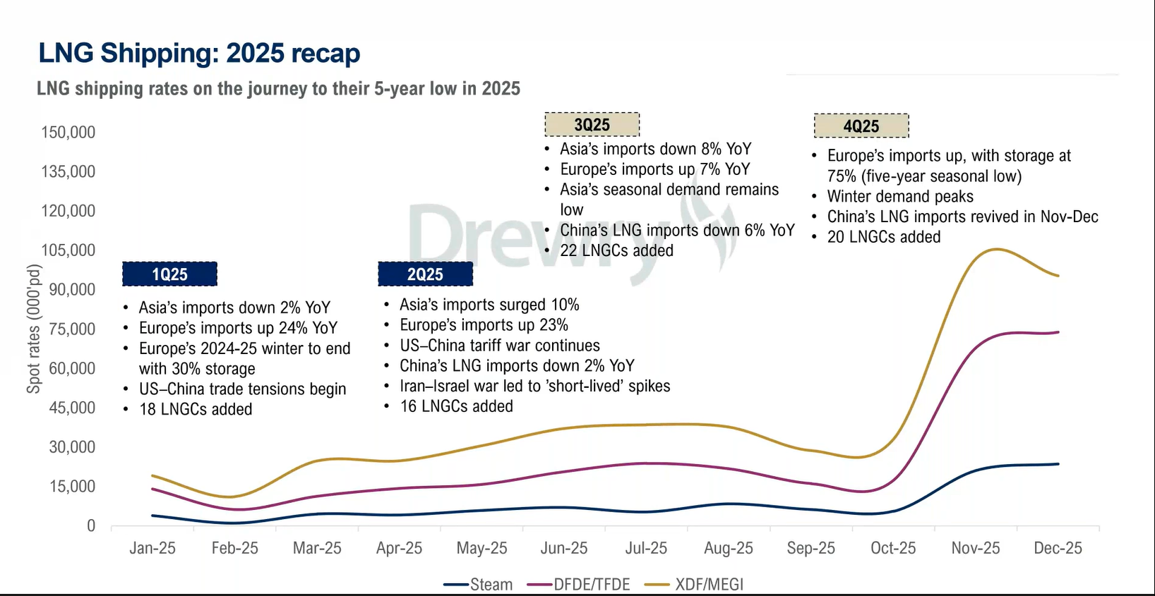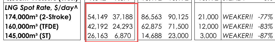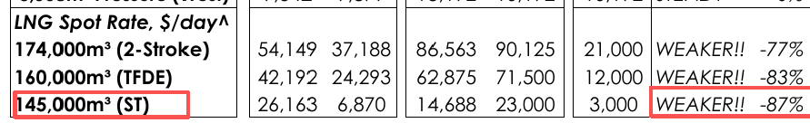 在克拉克森口径下,上周174k两冲程参考现货约 21,000美元/天,预期继续下降,其他LNG船型费率也从此前阶段高位回撤,两冲程下降约 77%、TFDE下降83%、蒸汽船更直接暴跌87%。