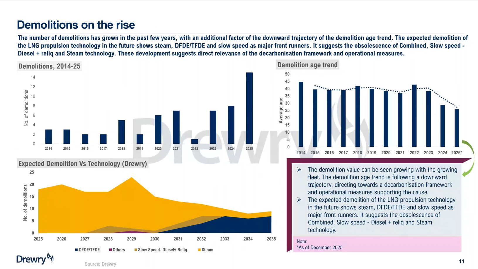 Drewry指出,近年来拆解数量呈上升趋势,且拆解船龄趋势下行;未来拆解在技术路线上的主力包括 Steam、DFDE/TFDE,以及慢速柴油+再液化等早期方案,并强调这一变化与“脱碳框架与运营措施”具有直接相关性。