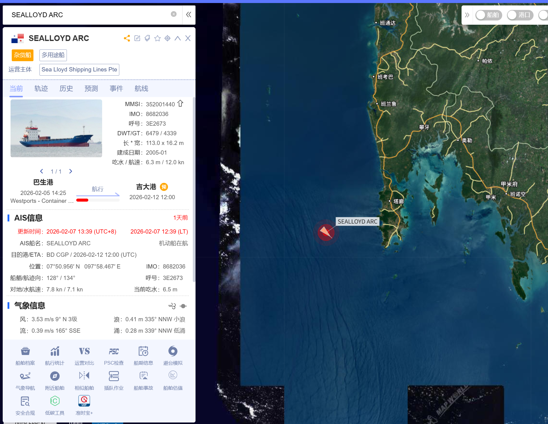 据船视宝数据显示,“SEALLOYD ARC”号为一艘巴拿马籍普通杂货船(General Cargo Ship。该船建于 2005年,载重吨约6,479吨。船舶注册港与船旗国均为巴拿马。运营与登记船东为Sea Lloyd Shipping Lines Pte(新加坡),技术管理与DOC公司为Naaf Marine Services(孟加拉国)。
