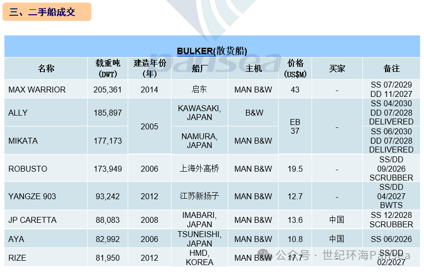 散货二手船市场,纽卡斯尔型散货船“MAX WARRIOR”(205,361载重吨,2014年启东船厂建造,SS 07-2029/DD 11-2027)据报以4,300万美元出售。海岬型散货姊妹船“ALLY”(185,897载重吨,2005年日本川崎建造,SS 04-2030/DD 07-2028)和“MIKATA”(177,173载重吨,2005年日本名村建造,SS 06-2030/DD 07-2028)据报以3,700万美元打包出售,已交付;“ROBUSTO”(173,949载重吨,2006年上海外高桥建造,SS/DD 09-2026,安装废气洗涤器)据报以1,950万美元出售。超巴拿马型散货船“YANGZE 903”(93,242载重吨,2012年江苏新扬子建造,SS/DD 04-2027,安装压载水系统)据报以1,270万美元出售。卡姆萨尔型散货船“JP CARETTA”(88,083载重吨,2008年日本今治建造,SS 12-2028,安装废气洗涤器)据报以1,360万美元出售给中国买家;“AYA”(82,992载重吨,2006年日本常石建造,SS 06-2026)据报以1,080万美元出售给中国买家。巴拿马型散货船“ANTHEA”(76,781载重吨,2006年日本佐世保建造,SS/DD 04-2026)据报以970万美元出售;“NILOS”(75,880载重吨,2006年日本常石建造,SS 01-2030)据报以1,160万美元出售给远东买家。ULTRAMAX型散货船“MITSOS”(63,526载重吨,2013年澄西船厂建造,SS 06-2028/DD 09-2026,4x30吨克令吊)据报以2,050万美元出售给希腊买家。超灵便型散货船“FLORINDA”(58,791载重吨,2008年菲律宾常石建造,SS 09-2028,4x30吨克令吊)据报1,260万美元出售给中国买家;“INDIGO SPICA”(58,052载重吨,2014年日本SHIN KURUSHIMA建造,4x30吨克令吊,SS 07-2029/DD 06-2027)据报以2,050万美元出售给希腊买家;“MDM BROMO”(53,633载重吨,2007年扬州大洋建造,4x35吨克令吊,SS/DD 07-2027)据报以810万美元出售。灵便型散货船“JETSTREAM”(34,563载重吨,2012年韩国SPP建造,4x35吨克令吊,SS/DD 05-2027)据报以约1,350万美元出售。