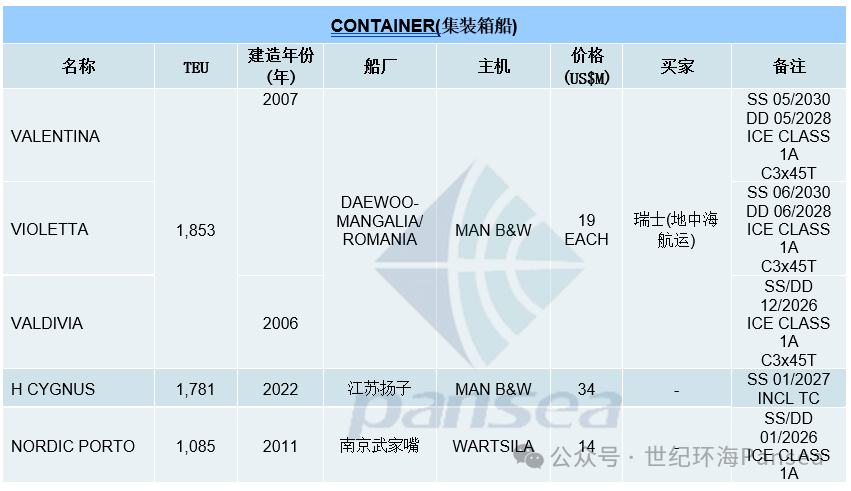 集装箱二手船市场,3艘罗马尼亚DAEWOO-MANGALIA船厂2006-2007年建造的带吊、带冰级1A的支线集装箱姊妹船“VALENTINA”、“VIOLETTA”和“VALDIVIA”据报以每艘1,900万美元打包出售给地中海航运;“H CYGNUS”(1,781TEU,2022年江苏扬子船厂建造,SS 01-2027)据报以3,400万美元出售,附带到2026年12/2027年1月的租约;“NORDIC PORTO”(1,085TEU,2011年南京武家嘴船厂建造,SS/DD 01-2026,冰级1A)据报以1,400万美元出售。