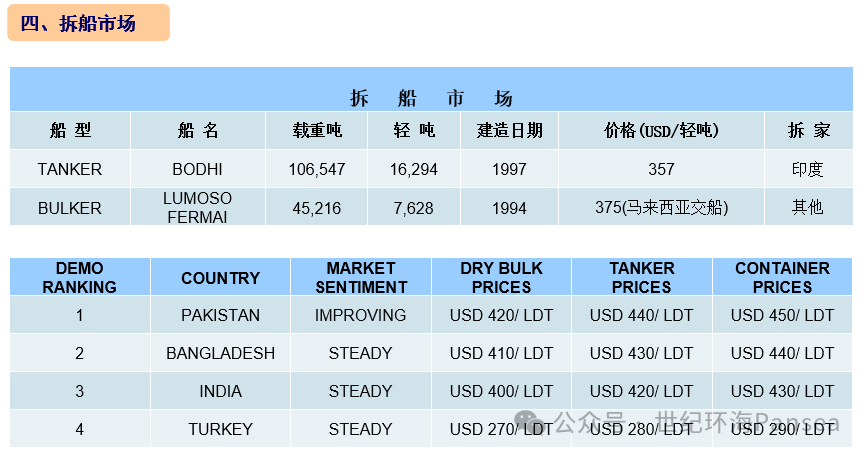 拆船市场,次大陆船舶回收市场持续遭受苦难。特朗普近期对加拿大、欧洲甚至巴基斯坦进一步加征关税的威胁使全球金融市场变得更加动荡。本周,除钢板价格继续下跌外,其他指数/指标涨势显著。其中,波罗的海指数大幅上涨,石油价格上涨近1%,收于65.1美元/桶,美元兑各拆船国货币的汇率也有所上涨。令人意外的是,据报,本周次大陆各拆船市场均有吨位抵达,这是很长时间以来的首次。随着中国农历新年的到来以及预计在2月将出现一系列地缘政治和金融方面的冲击,船舶供应量可能会进一步放缓。孟加拉国市场此前曾多次错失竞争机会,本周终于看到当地买家重回竞标桌,这无疑是一件好事。本周,有几艘不同类型的油轮抵达当地,其中一艘甚至已交付。当地有关一些小型油轮以低价转售的消息也逐渐浮出水面。国内基本面方面,当地钢板价格已连续两周表现不佳,维持在487.24美元/吨,本周孟加拉国塔卡兑美元的汇率贬值1%,收于BDT 122.95。总体来讲,孟加拉国的船舶交易虽带来短期积极信号,但其政治经济的深层次矛盾仍需通过改革与稳定措施逐步解决。印度市场,近期印度卢比兑美元的汇率波动剧烈,截至本周末收于RS 91.82(较年初进一步贬值25个基点)。目前市场普遍担忧卢比可能进一步贬值至RS 100的水平,而当地钢板价格也一度跌至近398美元/吨,随后又回升至约 401美元/吨(仍低于上周水平),这对该市场无疑产生负面影响,使得未来的收购变得更加困难。然而,令人讽刺的是:尽管当前的情况抑制市场情绪和需求,但反而印度市场又是所有拆解目的地中最繁忙的,本周有6艘船舶(包括1艘大型油轮)抵达阿朗港口。由于各国纷纷采取行动将本国货币与美元挂钩,本周全球市场对此反应一致且较为消极,未来次大陆船舶回收市场的这种错综复杂的竞争态势将会变得异常激烈。巴基斯坦市场的环保回收领域持续发展,该国第2家船厂——SALAMS INTERNATIONAL符合《香港公约》标准,这或许将进一步削弱邻国的采购能力。国内基本面方面,当地钢板价格处于“低谷期”,本周保持平稳,但依旧维持在587美/吨的行业领先水平,巴基斯坦卢比兑美元的汇率下跌约1.4%,收于PKR 282。据报,近期多笔超灵便型和巴拿马型散货船销售交付给加达尼买家,主要因当地报价相对印度更具竞争力,且进口需求持续增长。本周,在海岬型散货船回收竞标中,巴基斯坦的吸引力进一步凸显。目前,该市场呈现“缓慢而稳定的增长”态势,结合“迟来但更好的情况”,预计未来市场环境将更加有利,基础设施建设和工业发展有望持续推进。