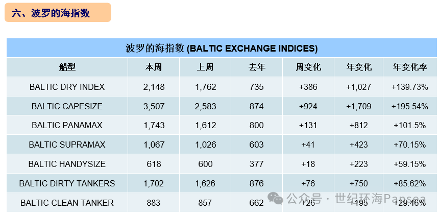 本周干散货运输市场,所有船型运价指数继续回升。其中,海岬型船运价指数大幅上涨924点,巴拿马型船运价指数上涨131点,超灵便型船运价指数提升41点,灵便型船运价指数微升18点,最终波罗的海干散货综合运价指数(BDI)收于2,148点,涨幅为21.91%。