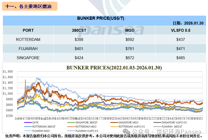 海岬型散货船5条航线平均日租金31,809美元,较一周前上涨35.76%;卡姆萨尔型散货船5条航线平均日租金15,686,较一周前上涨8.15%;巴拿马型散货船4条航线平均日租金14,350美元,较一周前上涨8.98%;ULTRAMAX型散货船11条航线平均日租金13,489美元,较一周前上涨3.96%;灵便型散货船7条航线平均日租金11,124美元,较一周前上涨3.07%。