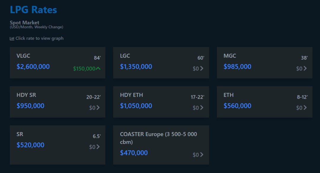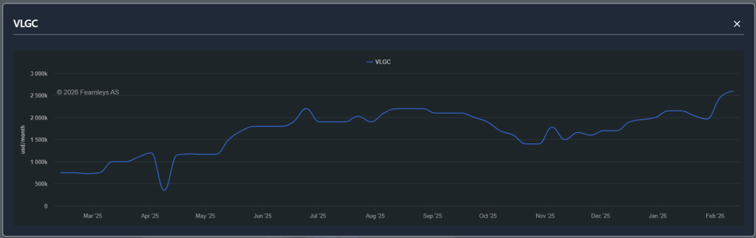 据另一家经纪公司Fearnleys数据显示,目前VLGC运价处于260万美元/月的水平,较上周上涨15万美元,上涨6%。