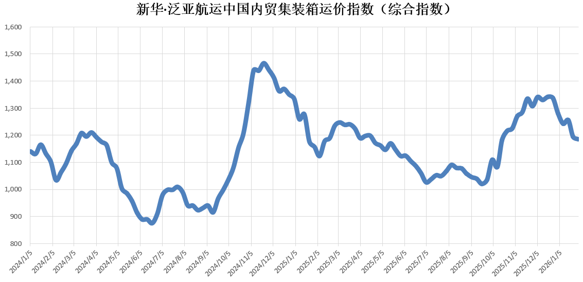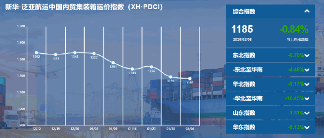 核心提示:本期(2026年1月31日至2月6日)新华·泛亚航运中国内贸集装箱运价指数(XH·PDCI)报1185点,较上期(2026年1月24至2026年1月30日)下跌10点,跌幅0.84%;同比上涨27点,涨幅2.33%;6只区域子指数两涨四跌,4只流向指数两涨两跌。
