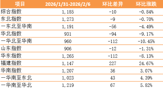此外,山东指数报906点,环比下跌12点,跌幅1.31%;华东指数报1265点,环比下跌112点,跌幅8.13%;福建指数报1147点,环比上涨227点,涨幅24.67%。