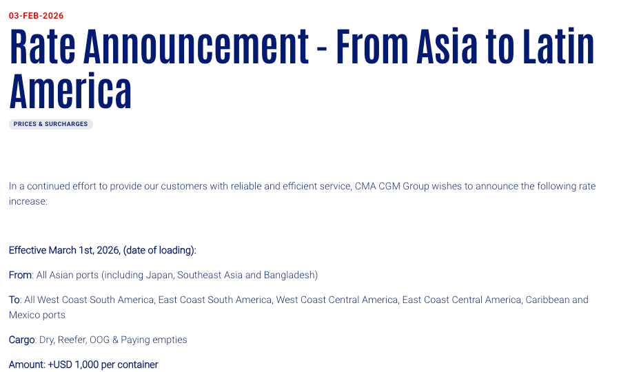 亚洲-拉美:3月1日(装运日)起,所有亚洲港口(含日本、东南亚、孟加拉国)至南美洲东西海岸、中美洲东西海岸、加勒比海地区及墨西哥所有港口的货物,每个集装箱加收1000美元,覆盖货类无例外。