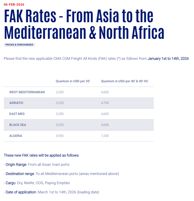 亚洲至地中海和北非:在3月1日至14日期间适用新FAK费率,短期运价波动明显。