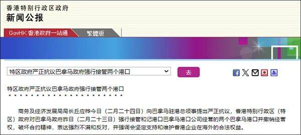 事实上,香港 特区政府2月24日发布新闻公报,严正抗议巴拿马政府强行接管两个港口。