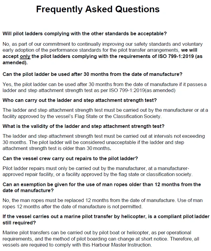 但是IMO的标准却没有跟上来,即使几乎全部缔约国港口尤其澳洲港口已经根据ISO新标准要求来访船舶引水梯的规范以及安装使用要求,时至今日,引水梯证书和铭牌上依旧是符合Resolution A.1045(27),但是生产厂家不得不顺应港口国要求将引水梯设计标准符合ISO 799-1:2019规范,而不是ISO 799:2004。实际上现在很多港口对引水梯及其附件的设计规范、安装、使用标准等要求甚至高于MSC.576(110)和MSC.1-Circ.1428-Rev.1决议的要求,例如: