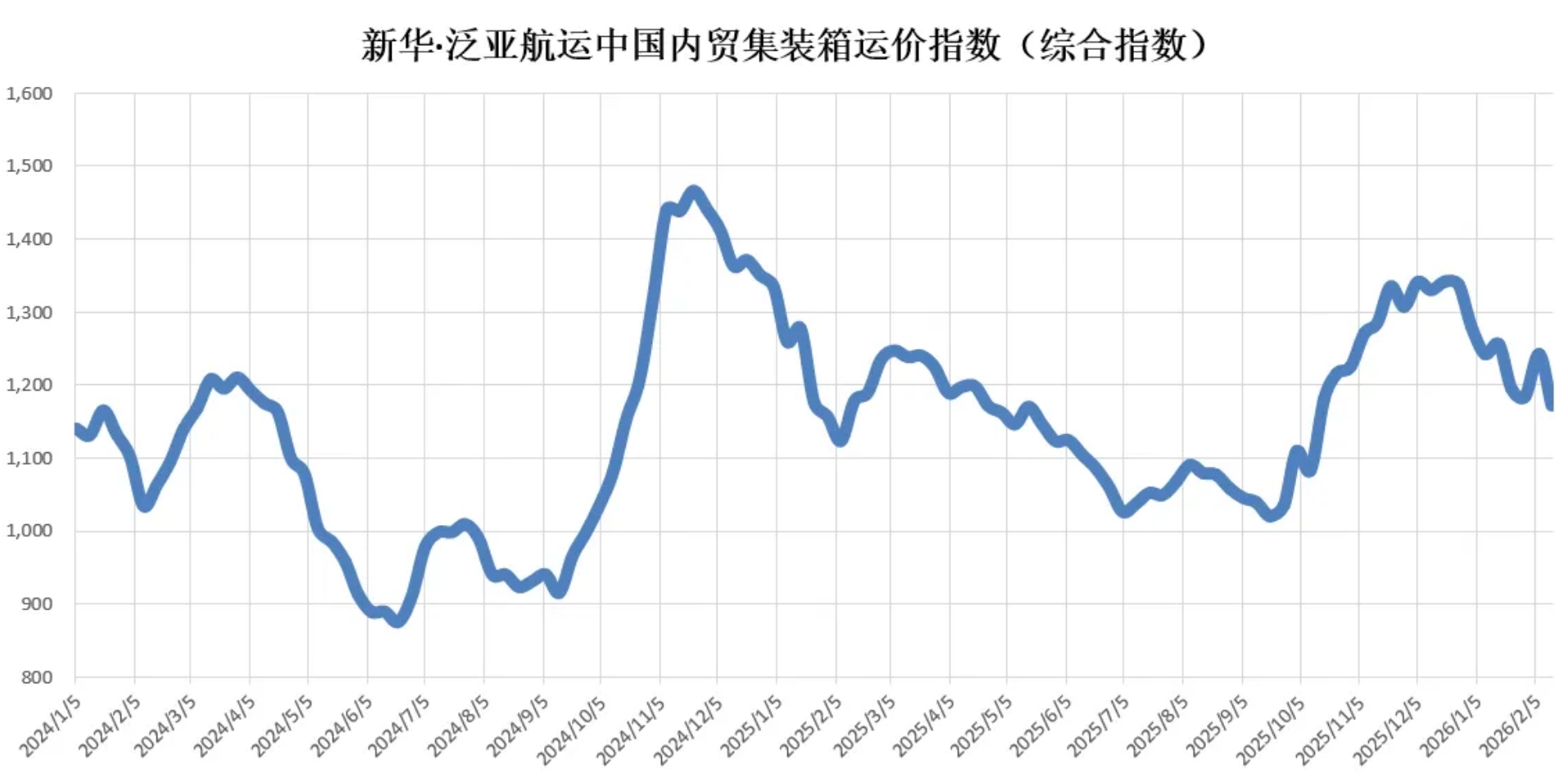 核心提示:本期(2026年2月14日至2月20日)新华·泛亚航运中国内贸集装箱运价指数(XH·PDCI)报1173点,较上期(2026年2月7至2026年2月13日)下跌69点,跌幅5.56%;同比下跌6点,跌幅0.51%;6只区域子指数一涨五跌,4只流向指数全部下跌。