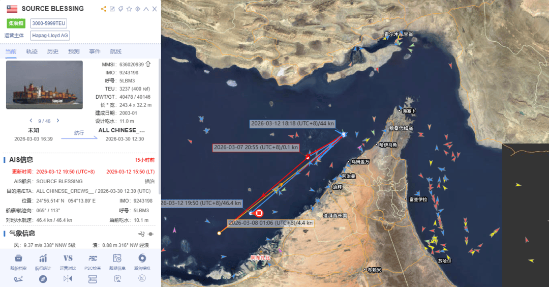 当地时间 3 月 12 日凌晨 2 点 20 分,马士基从赫伯罗特租用的 “Source Blessing” 轮在杰贝阿里港附近海域被导弹碎片击中,船上起火,火势已被扑灭,船员安全。这是近期遭遇袭击的第19艘船舶。