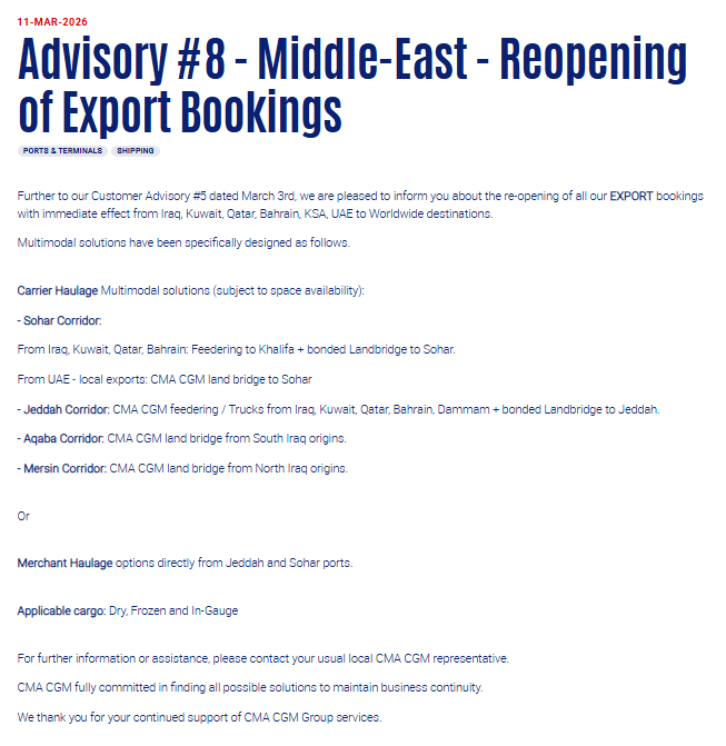 在出口方向之外,达飞随后又进一步宣布,恢复发往上述中东国家的进口订舱业务。换句话说,达飞此次恢复的不是单一方向上的部分业务,而是围绕多个中东市场,重新建立起进出口双向承接能力。