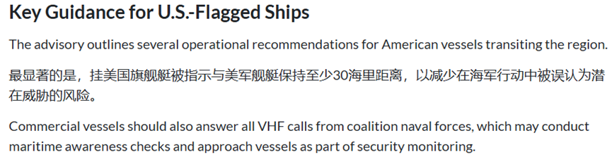 美国海事局(MARAD)发布安全警告,指示所有悬挂美国国旗的船只"无视"伊朗的航线偏转命令,并强制要求美国籍商船与美军舰保持至少30海里的安全距离,这种对抗性指令使得任何美国关联船舶试图通过海峡的商业可行性降至冰点。