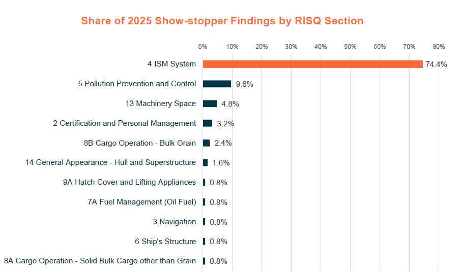 数据显示,2025年共有125项检查发现被判定为Show-stopper,占所有完成检查的2.6%,这类问题均为极高风险安全隐患,也是船方在日常运营和检查准备中需要重点规避的问题。