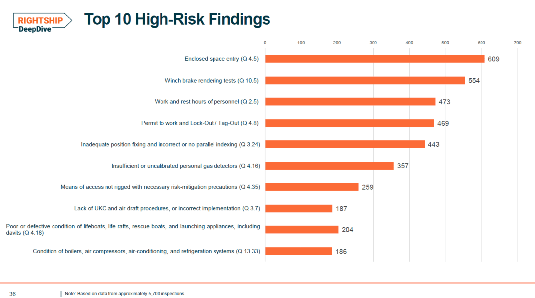 RightShip基于约5700艘次船舶检查的大数据,披露了船舶运营各环节的检查发现及高风险问题。此次检查覆盖船体上层建筑、ISM体系、航行安全、系泊作业等多个核心板块。