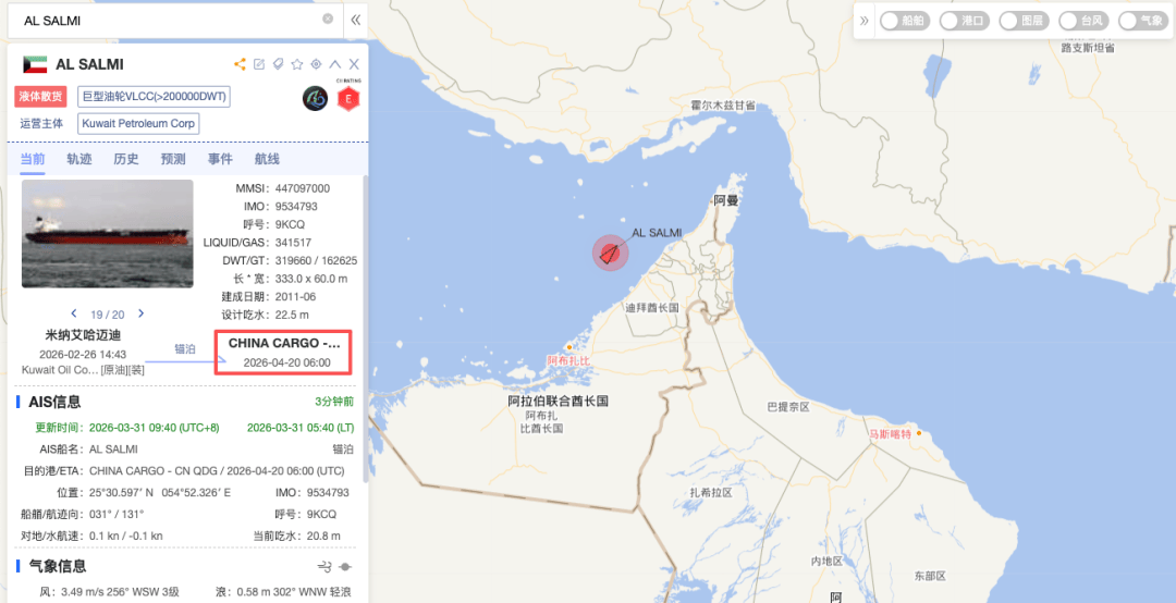 从船视宝提供的资料来看,“Al Salmi”轮 IMO 9534793,为一艘2011年建造、319,660载重吨的VLCC,悬挂科威特旗,注册/运营方为 Kuwait Oil Tanker Company。该轮AIS信息显示,其事发前后处于Jebel Ali Anchorage 一带,航次目的地标注为 “CHINA CARGO - CN QDG”,预计抵达中国时间为 4月20日。这也意味着,这起事件不仅是一次区域安全事件,同时还是一次与中国原油运输链条直接相关的海上突发事件。这也是市面上披露以来,第一艘AIS明确标注中国货物也遭遇袭击的船舶。
