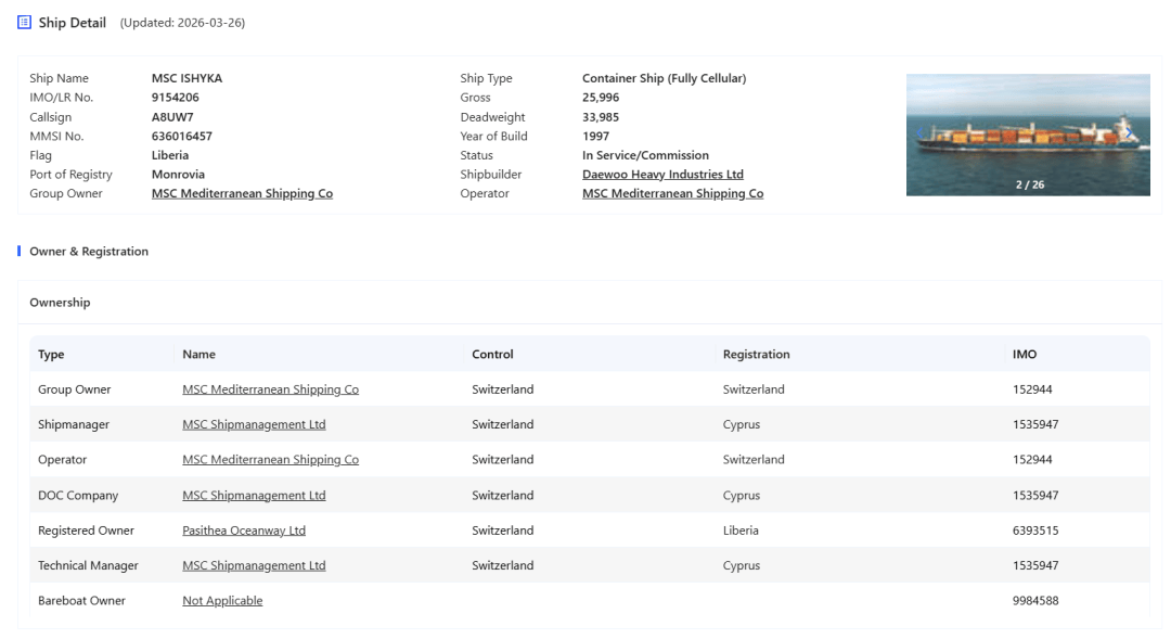 从船舶基本资料看,这艘船目前公开可见的信息包括:挂利比里亚旗,MMSI为636016457,载箱量约2453 TEU,载重吨约33,985 吨。部分公开数据库还显示,该轮注册船东为Pasithea Oceanway Ltd,管理方为MSC Shipmanagement Ltd。这说明该轮与全球最大班轮公司地中海航运(MSC)体系存在管理联系,但截至目前,MSC尚未就此次袭击事件公开作出正式回应。因此,关于船舶实际受损程度、是否造成船员伤亡、是否影响后续营运安排等,仍有待官方进一步确认。