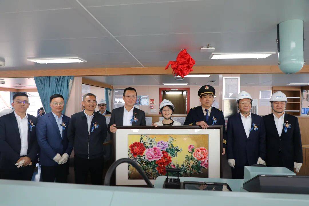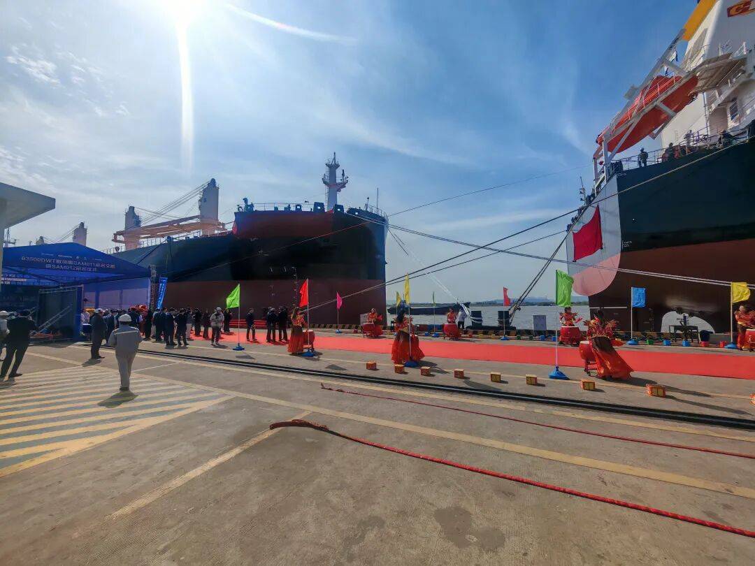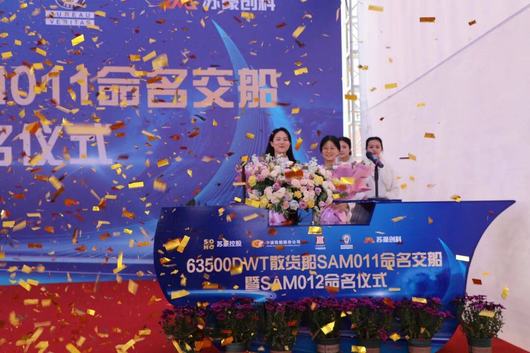 新船命名交付仪式在江苏苏豪船厂举行,各界领导嘉宾齐聚一堂共同见证。苏豪创科集团、中建投租赁、中波公司等项目相关方领导先后致辞。两艘新船在两位船母命名祝福声中开启上线营运倒计时。