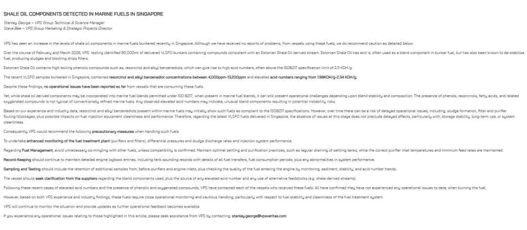 VPS 表示,截至目前,其已联系到接收相关燃油的船舶,这些船舶均反馈“暂未出现运行故障”;但 VPS 同时强调,页岩油衍生组分即便在纸面上仍可能符合 ISO 8217 的常规指标要求,也并不意味着没有后续风险,因为这类燃油可能在储存稳定性、长期使用过程以及系统清洁度方面,产生滞后性的操作问题。