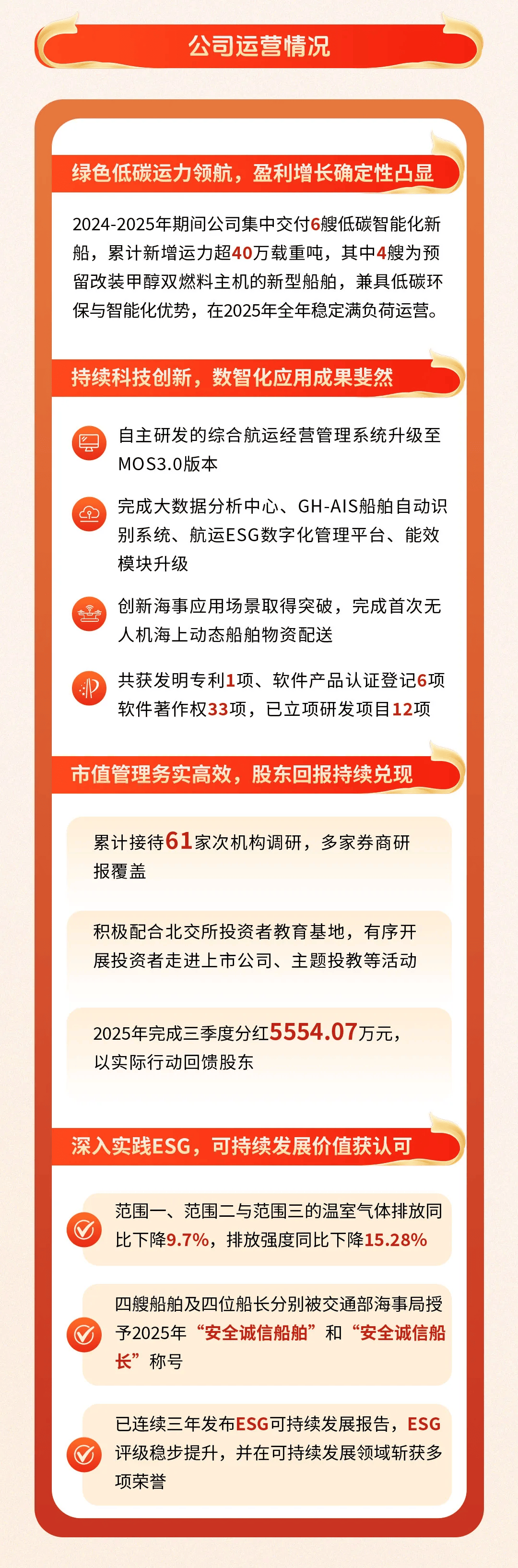 它的价值,不只在于营业收入接近10亿元、净利润增长22.28%,也不只在于温室气体排放下降、绿色运力持续增长,更在于这家公司已经逐步形成一套比较完整的竞争框架:以内外贸兼营和战略物资运输为底盘,以绿色船队和数智系统为增量,以安全、治理和资本市场沟通为支撑,努力把一家传统干散货上市公司,改造成一家更有韧性、更有方向感的现代航运企业。