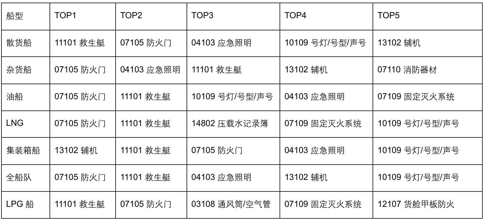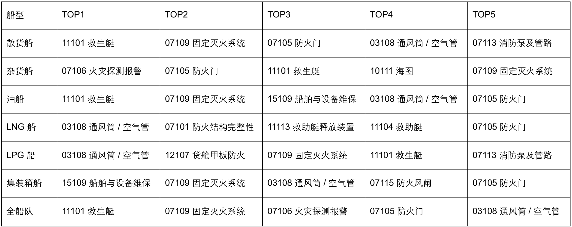 ● 防火门 07105 跻身所有船型 TOP5,为全船队头号缺陷;● 救生艇 11101 稳居第二,涉及水密、艇机、备品、释放演练等多类技术与操作问题,作为弃船核心救生设备,状态合规至关重要;