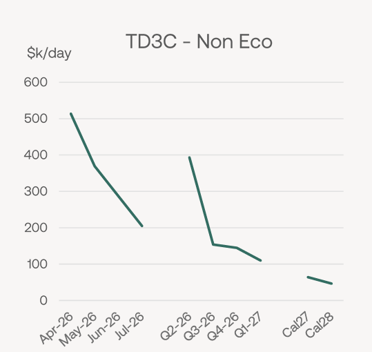Braemar在4月17日周报中指出,TD3C的远期运费协议( FFA)走势已经明显转弱:Balmo从500一度跌至430,收在450;5月合约从430滑落至320后,最新成交回到370;6月合约在250至332.5之间反复成交,最终收在285。换句话说,虽然现货屏幕上的TD3C仍挂在极高位置,但市场对后续价格延续性的判断,已经不像前几周那样激进。