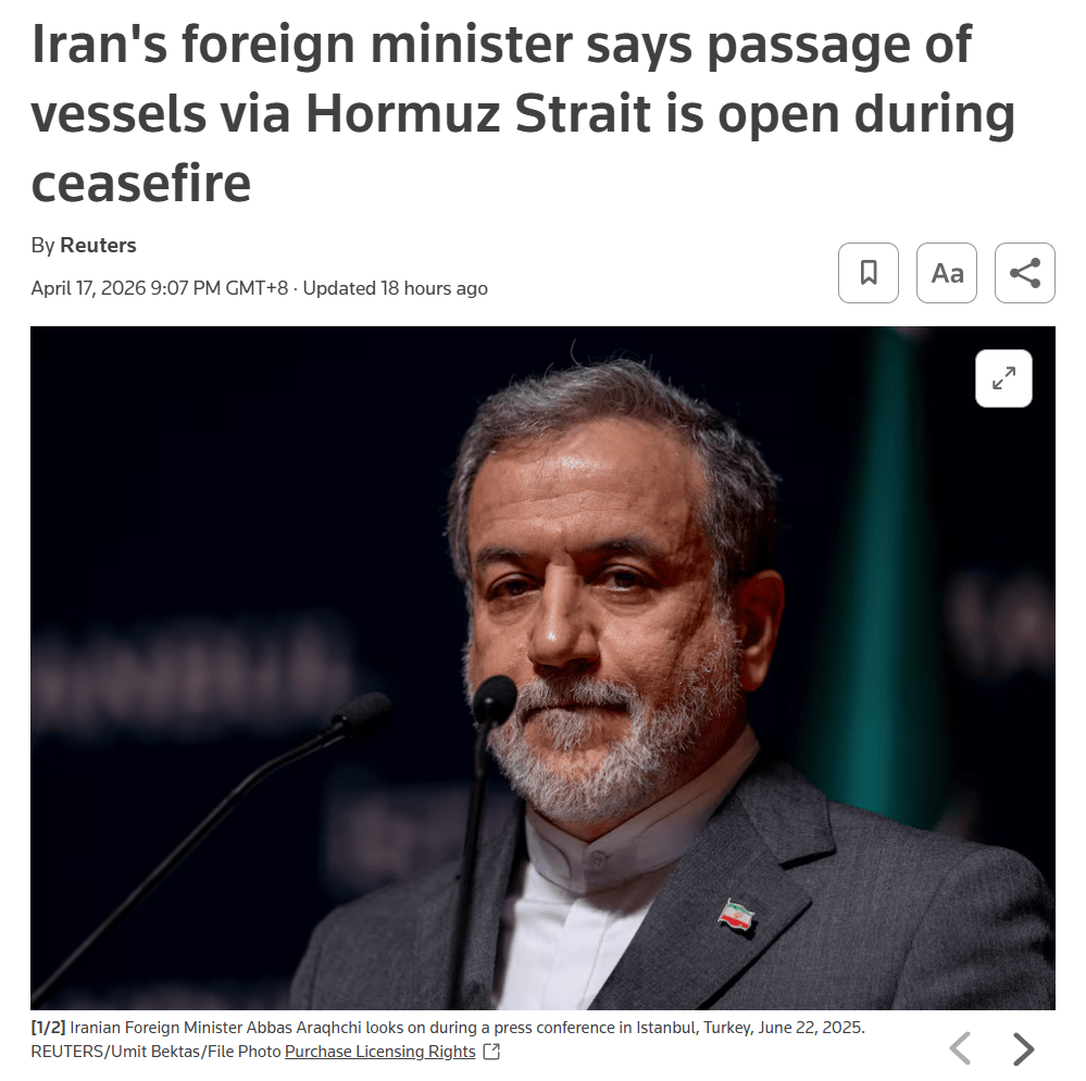 当地时间4月17日,伊朗外长阿拉格齐在社交媒体上宣布,在停火剩余期间,霍尔木兹海峡已对所有商业船舶“完全开放”。然而,随后披露的执行规则、船舶动态以及国际航运业的反应来看,现实远没有全面开放这么简单。至少到目前为止,霍尔木兹海峡更接近一种“受控开放、许可通行、军事监管”下的有限恢复,而不是危机前那种常态化、稳定化的自由通航。