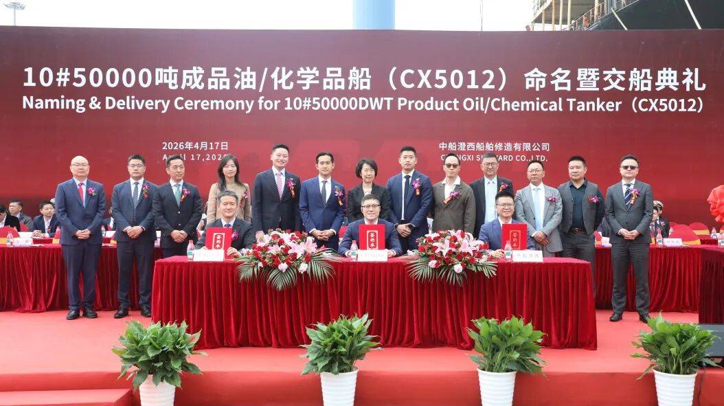 4月17日,中船集团旗下中船澄西船舶修造有限公司为新加坡Singfar公司建造的首艘50000吨MR油化船“CS SAKER”轮胜利交付,这也是中船澄西今年交付的第14艘新造船。