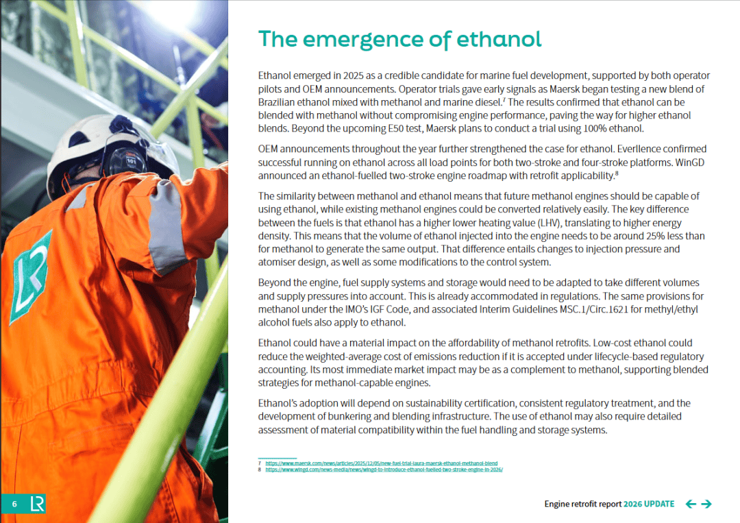 从燃料路径看,甲醇之外,LNG和乙醇也值得关注。LR报告指出,LNG retrofits仍在被船东讨论,原因在于其供应链更成熟、加注网络更完善、双燃料技术基础更广。报告还提到,针对已在役LNG双燃料发动机降低甲烷逃逸、提升整体排放表现的升级方案,也正在形成新的细分市场。