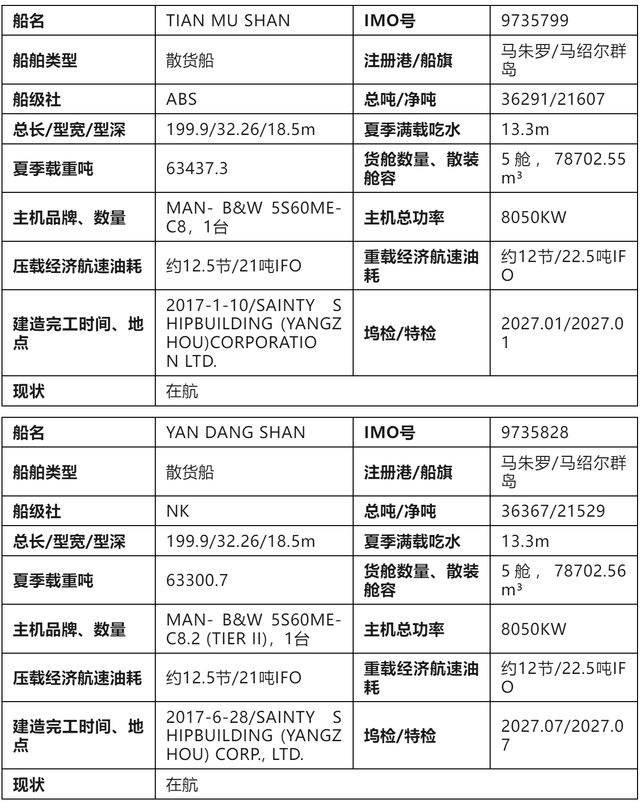 标的2:“TIAN MU SHAN”、“YAN DANG SHAN”轮2艘船整体打包为一个标的物;