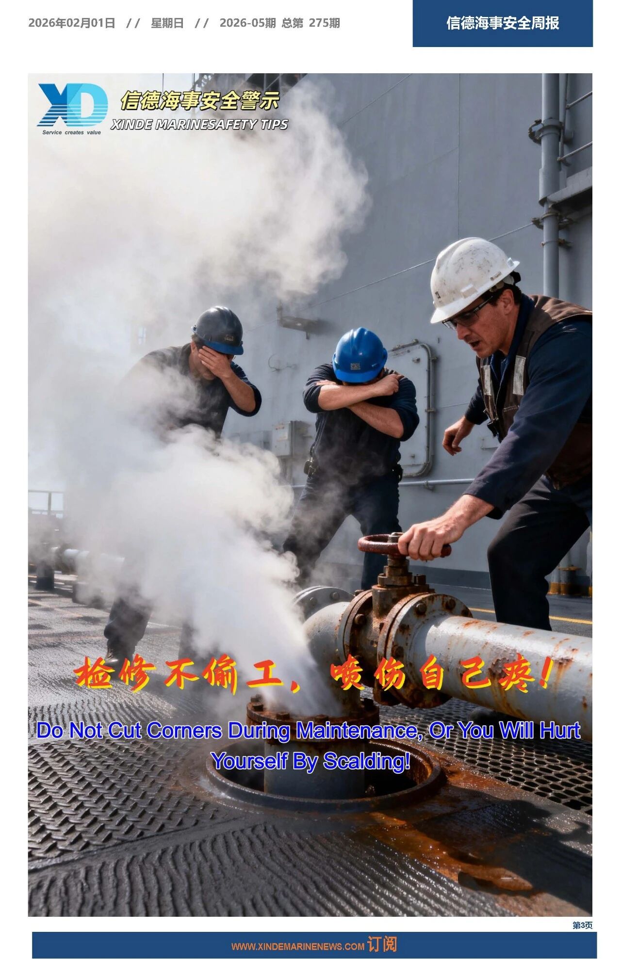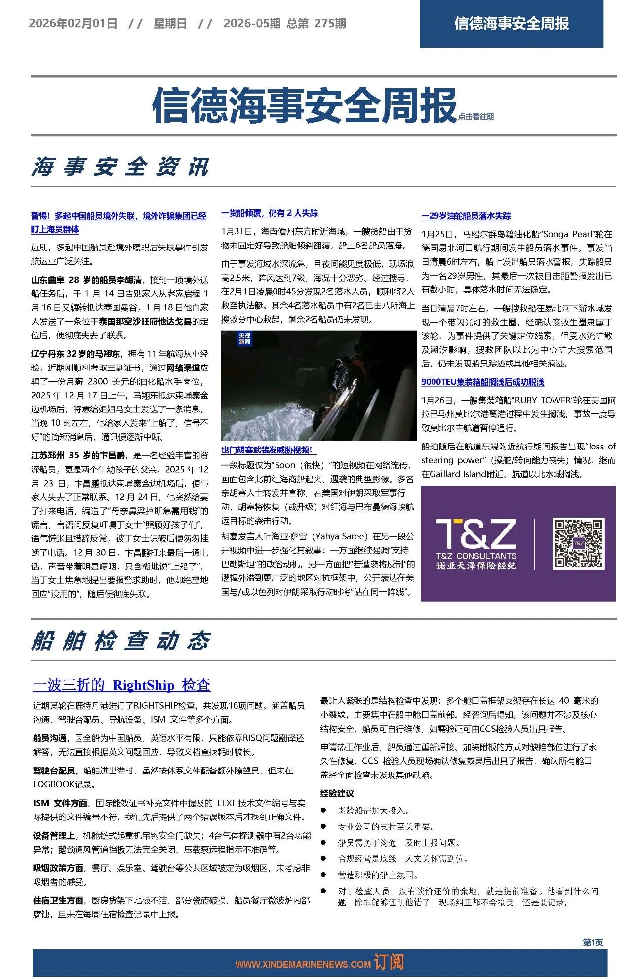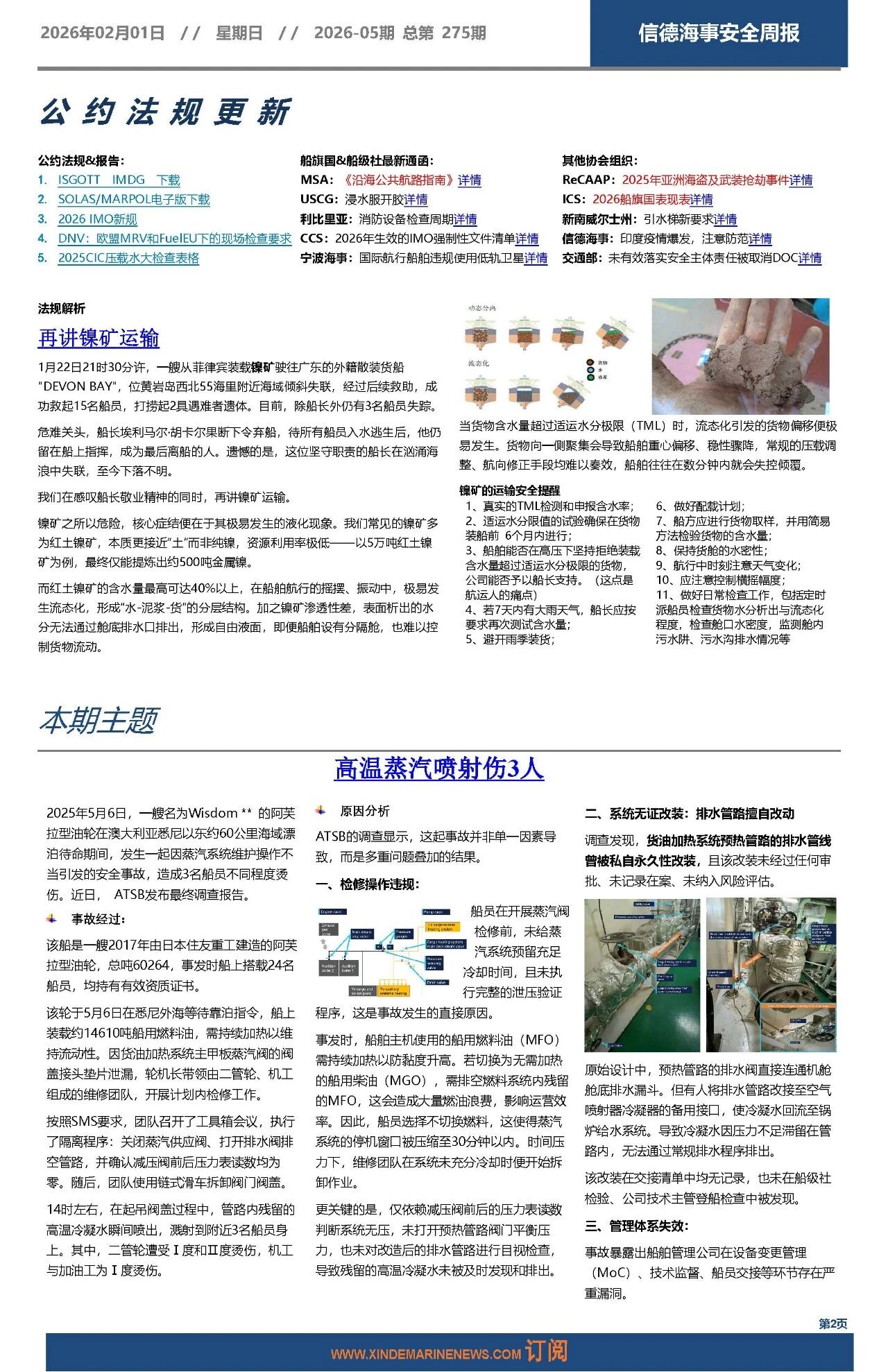 信德海事一直把实现海上更安全当作我们的愿景之一。2020年8月22日正式推出《信德海事安全周报》,2021年1月,《信德海事安全月报》上线;2021年2月,《信德海事安全指南》上线;2025年7月,《MARINE SAFETY BULLETIN》上线,实现中英双语发布。如有船公司需订阅以上产品,请发送邮件:safety@xindemarine.com,或联系主编:18641784019(微信)。