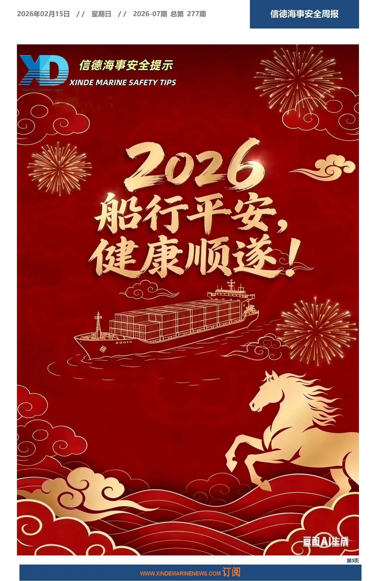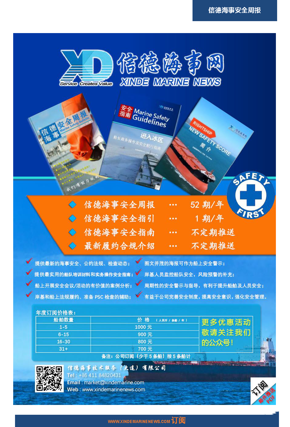 信德海事一直把实现海上更安全当作我们的愿景之一。2020年8月22日正式推出《信德海事安全周报》,2021年1月,《信德海事安全月报》上线;2021年2月,《信德海事安全指南》上线;2025年7月,《MARINE SAFETY BULLETIN》上线,实现中英双语发布。如有船公司需订阅以上产品,请发送邮件:safety@xindemarine.com,或联系主编:18641784019(微信)。
