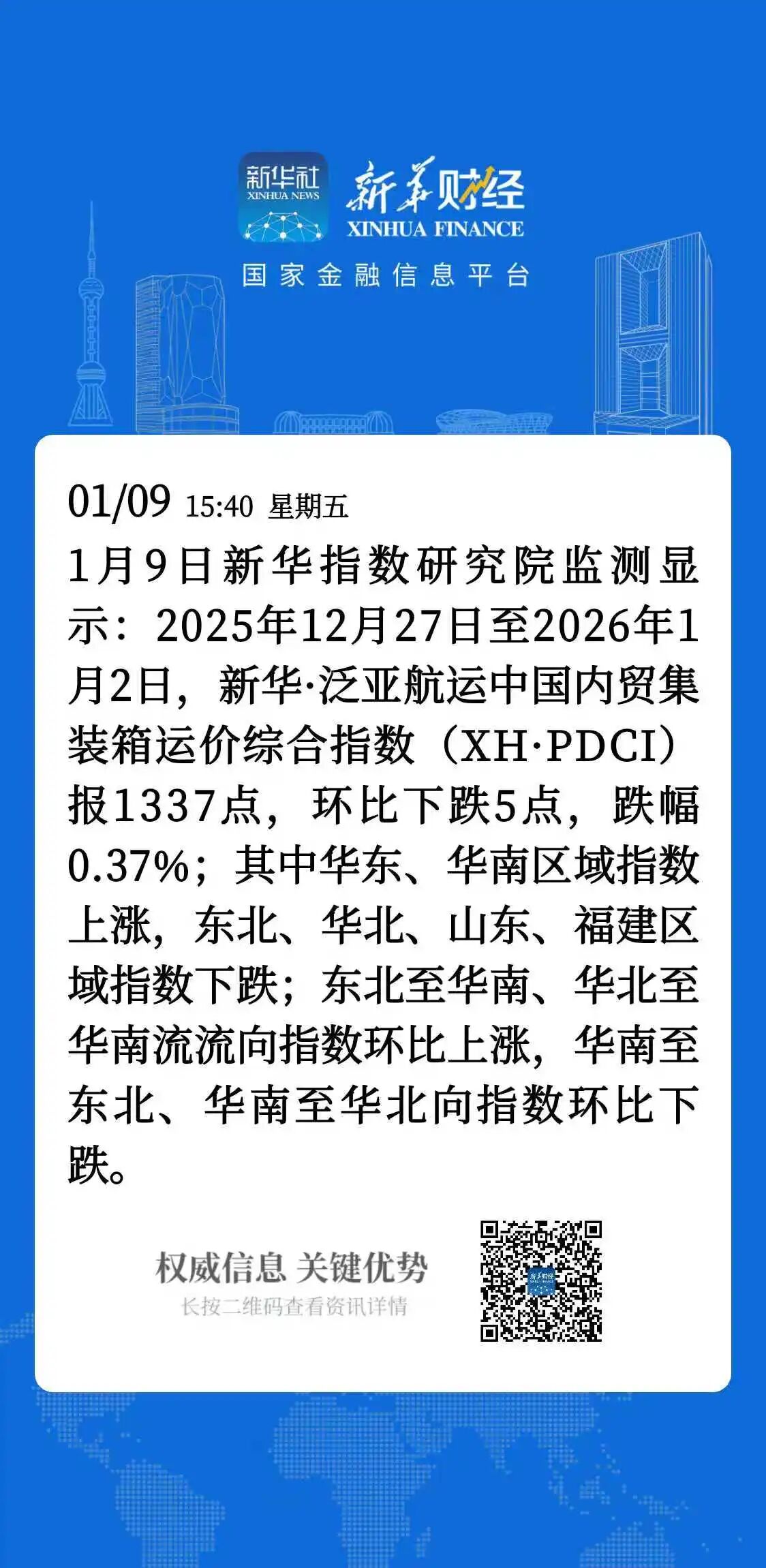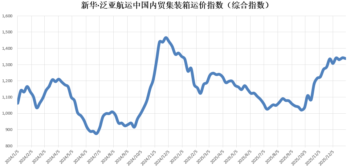 核心提示:本期(2025年12月27日至2026年1月2日)新华·泛亚航运中国内贸集装箱运价指数(XH·PDCI)报1337点,较上期(2025年12月20日至12月26日)下跌5点,跌幅0.37%;同比下跌14点,跌幅1.04%;6只区域子指数两涨四跌,4只流向指数两涨两跌。