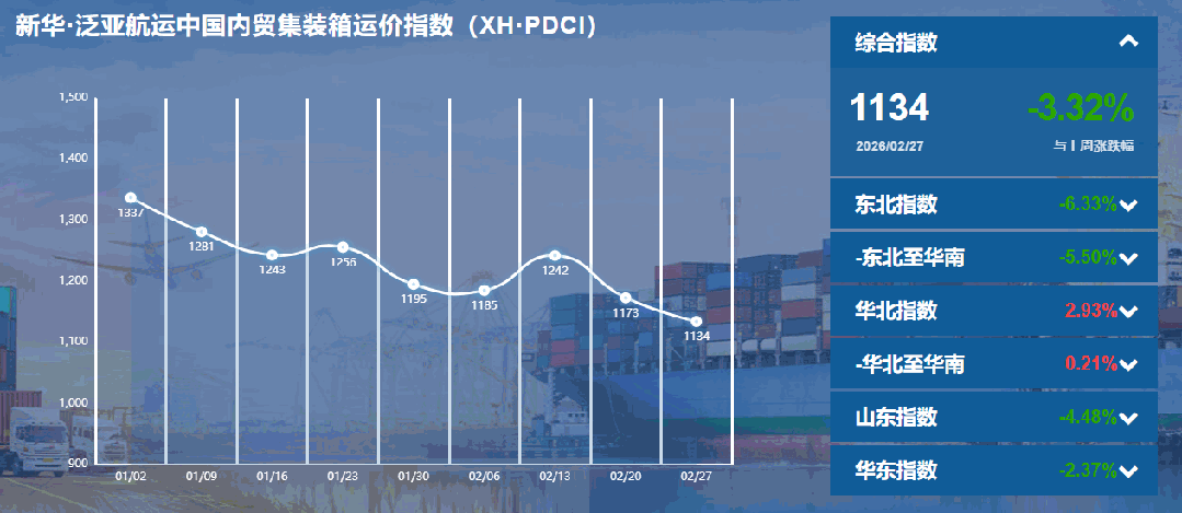 核心提示:本期(2026年2月21日至2月27日)新华·泛亚航运中国内贸集装箱运价指数(XH·PDCI)报1134点,较上期(2026年2月14至2月20日)下跌39点,跌幅3.32%;同比下跌56点,跌幅4.71%;6只区域子指数两涨四跌,4只流向指数两涨两跌。